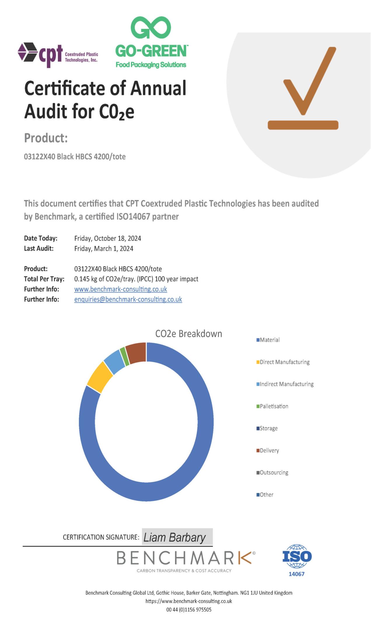The document sample below shows C0₂e emmissions per tray (available upon request).